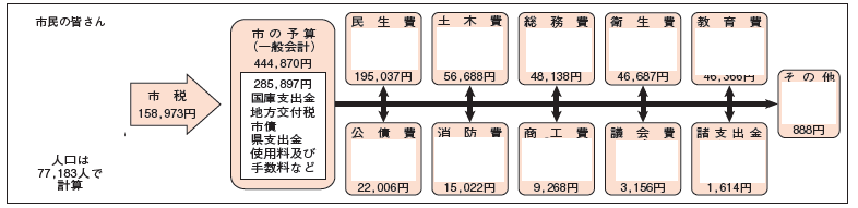 一方、収入では、市民税や固定資産税などの市税が1人当たり15万8973円です。その他、国庫支出金や地方交付税などの財源が28万5897円となっています。