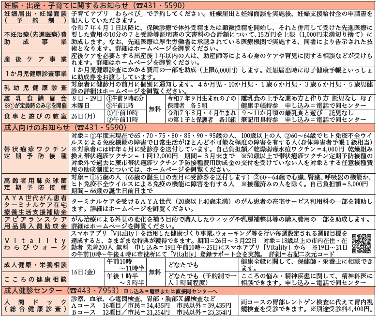 健康 お知らせ(保健センター) 21/32 前の記事 次の記事 発行日 : 2026年01月01日 自治体名 : 埼玉県蕨市 広報紙名 : 広報蕨 令和8年1月号 健康密度も日本一のまちへ 同センターの情報は、本紙またはPDF版掲載の二次元コードよりご覧ください。 Tweet シェアする お知らせ(健康保険)(2) お知らせ(緊急時にご利用を)