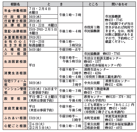 くらし ご利用ください 各種相談(無料) 30/32 前の記事 次の記事 発行日 : 2026年01月01日 自治体名 : 埼玉県蕨市 広報紙名 : 広報蕨 令和8年1月号 Tweet シェアする お知らせ(公民館・図書館) お知らせ(その他のお知らせ)