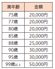 9月1日現在で、蕨市に引き続き1年以上住んでいる下表の年齢の人にお祝い金をお贈りします。
