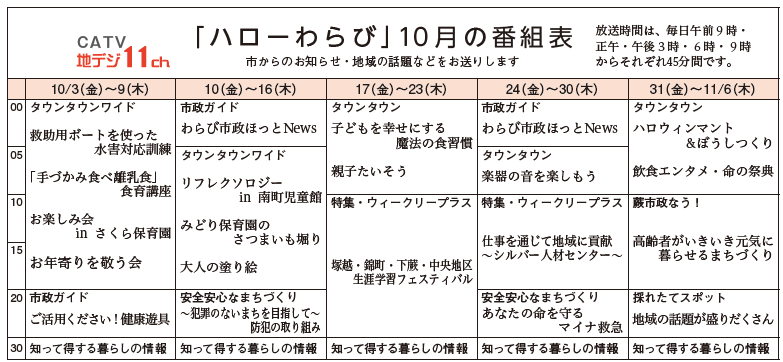くらし 「ハローわらび」10月の番組表 5/30 前の記事 次の記事 発行日 : 2025年10月01日 自治体名 : 埼玉県蕨市 広報紙名 : 広報蕨 令和7年10月号 「ハローわらび」DVD放送終了後から貸し出します 料金:無料 詳細・貸し出し場所:秘書広報課 【電話】433-7703 Tweet シェアする まちの話題 ほっと・エッセイ(180)