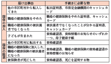 届け出の際は上表の必要な物と、届出者の本人確認ができる物、世帯主・対象者のマイナンバーを確認できる物が必要です。また、被用者保険(職場の健康保険など)の被保険者本人が75歳になり後期高齢者医療制度に入った場合、被扶養者だった75歳未満で他の被用者保険に入らない人は、国保加入の届け出が必要です。