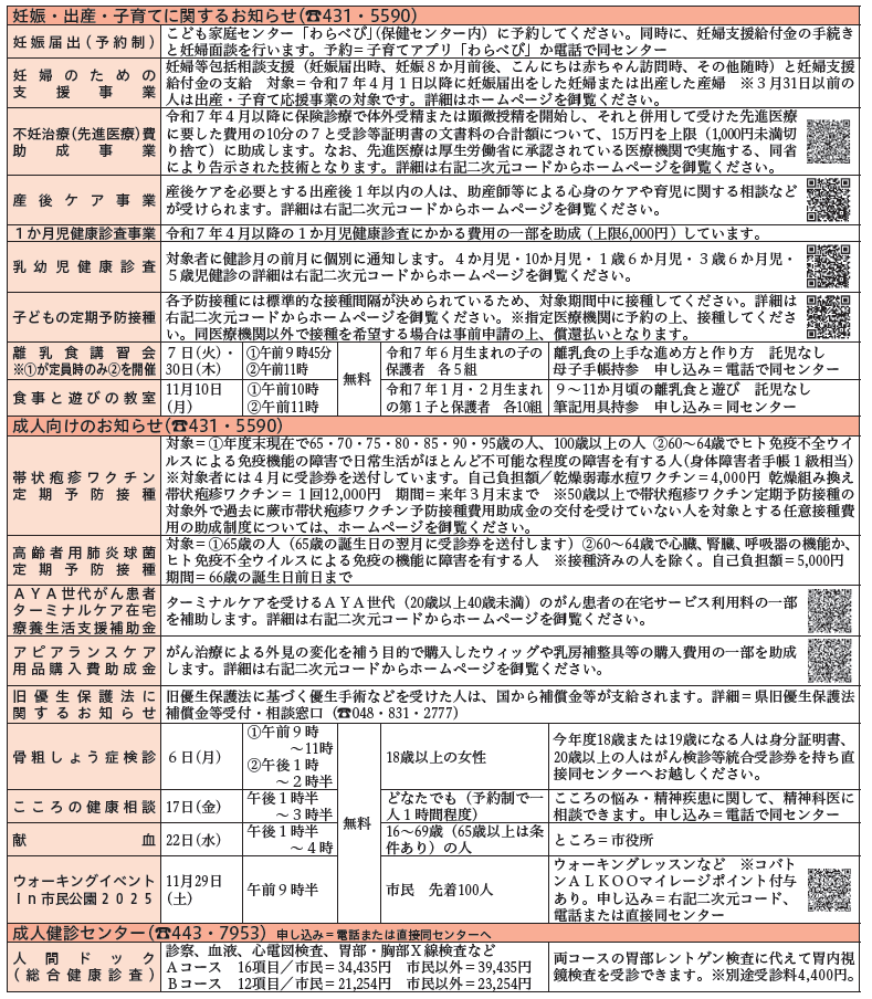 健康 お知らせ(保健センター) 16/30 前の記事 次の記事 発行日 : 2025年10月01日 自治体名 : 埼玉県蕨市 広報紙名 : 広報蕨 令和7年10月号 健康密度も日本一のまちへ 同センターの情報は、本紙またはPDF版掲載の二次元コードよりご覧ください。 Tweet シェアする お知らせ(健康保険) お知らせ(緊急時にご利用を)