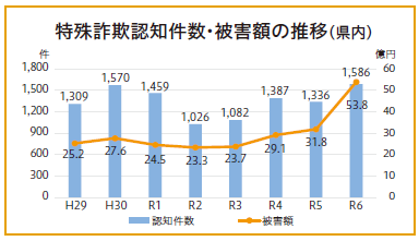 電話などで親族や公共機関の職員などを名乗り、現金などをだまし取る特殊詐欺。年々犯行の手口が巧妙化しているとともに、コロナ禍が明けて社会経済活動が再開するのに伴い、犯行が活発になっています。今年1月から9月末までに、県内では1355件、約57億8341万円の被害が発生。これは過去最多となった昨年の同時期より260件多く、被害額も約25憶3185万円増えています(参考下枠)。また、市内でも8件、約2741万5000円の被害が発生しています。