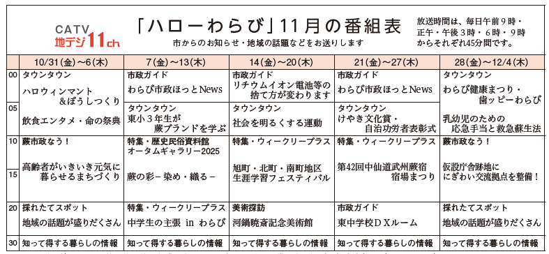 くらし 「ハローわらび」11月の番組表 8/30 前の記事 次の記事 発行日 : 2025年11月01日 自治体名 : 埼玉県蕨市 広報紙名 : 広報蕨 令和7年11月号 「ハローわらび」DVD放送終了後から貸し出します 料金:無料 詳細・貸し出し場所:秘書広報課 【電話】433-7703 Tweet シェアする まちの話題 ほっと・エッセイ(181)