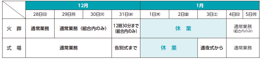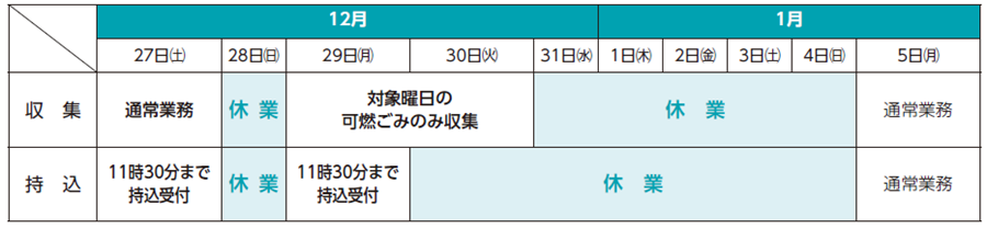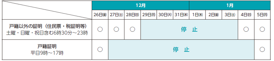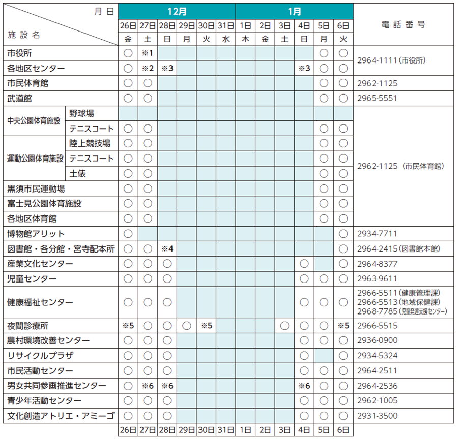 市役所および各施設の年末年始の業務は、下表のとおりです。