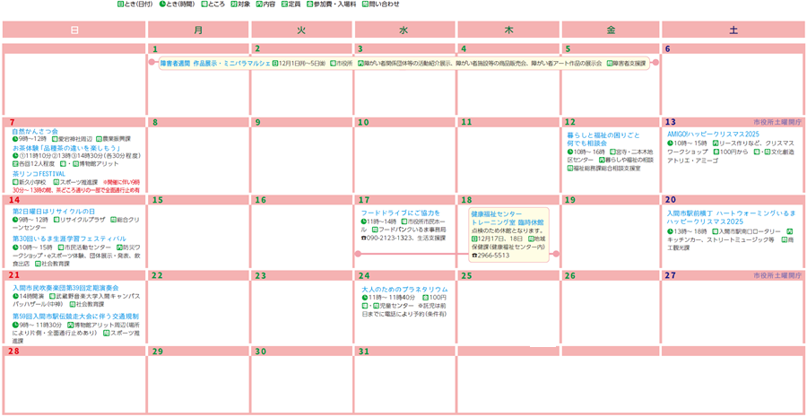 イベント 12月カレンダー 4/24 前の記事 次の記事 発行日 : 2025年12月01日 自治体名 : 埼玉県入間市 広報紙名 : 広報いるま 令和7年12月1日号 申し込み不要のイベントです。参加費等がかかるもののみ、金額を掲載しています。 Tweet シェアする 〔今月の注目記事〕年末年始の主な業務案内 土曜開庁 8時30分~12時