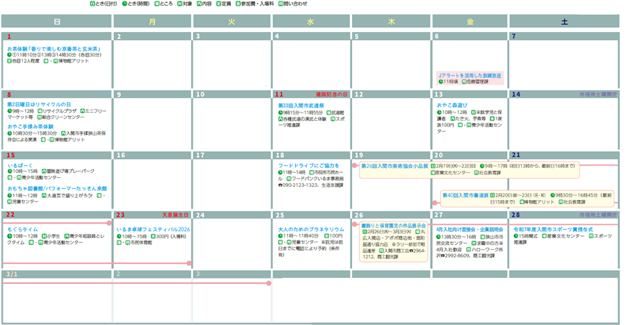イベント 2月カレンダー 8/23 前の記事 次の記事 発行日 : 2026年02月01日 自治体名 : 埼玉県入間市 広報紙名 : 広報いるま 令和8年2月1日号 申し込み不要のイベントです。参加費等がかかるもののみ、金額を掲載しています。 Tweet シェアする 〔あつまれ!いるまぐみ〕~その他 土曜開庁 8時30分~12時