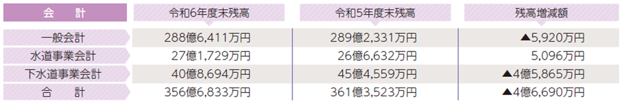 令和6年度末における市全体の借入金(借金)の残高は、356億6,833万円となりました。会計ごとの内訳は下表のとおりです。
