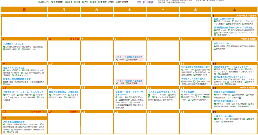 イベント 11月 カレンダー 6/23 前の記事 次の記事 発行日 : 2025年11月01日 自治体名 : 埼玉県入間市 広報紙名 : 広報いるま 令和7年11月1日号 申し込み不要のイベントです。参加費等がかかるもののみ、金額を掲載しています。 Tweet シェアする 〔今月の注目記事〕国民健康保険加入者の皆さまへ 今月の納期