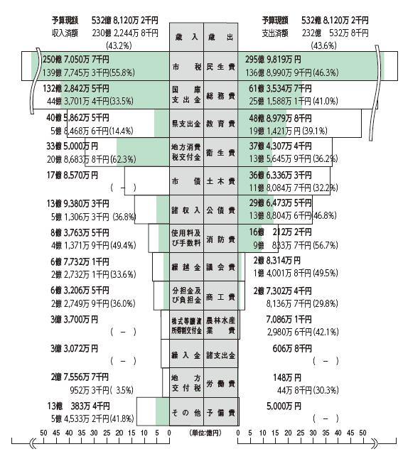 収入済額は、予算現額の43.2%にあたる230億2,244万8千円で、支出済額は、予算現額の43.6%にあたる232億532万8千円となっています。