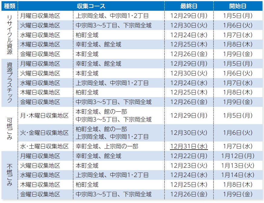 ※暦の関係で、水・土曜日に可燃ごみ収集の地区のみ、12月31日(水)も収集します。