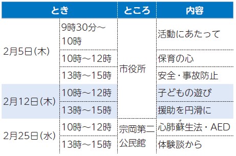 申込み・問合せ:各申込期限までに申込みフォーム、電話、メールまたは直接、ファミリー・サポート・センター(子ども支援課内)へ
