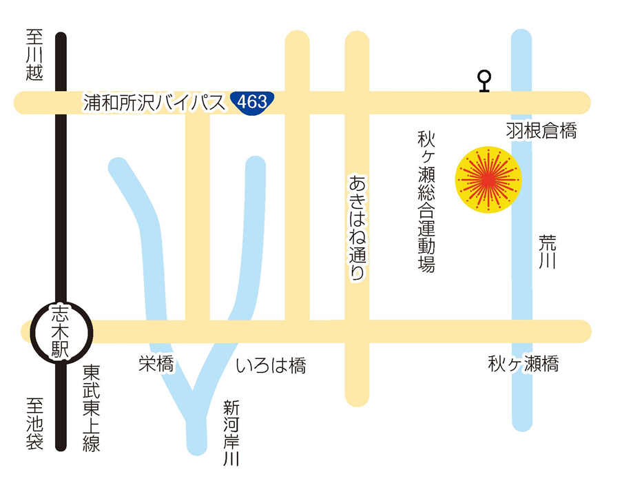 東上線「志木駅東口」から臨時バス(無料)を運行します。なお、会場に駐車場はありませんので、臨時バスまたは自転車などでお越しください。