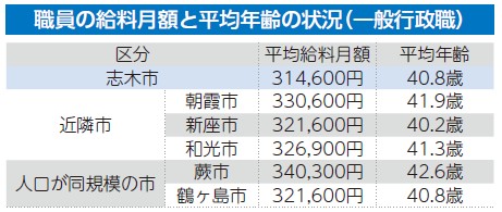 志木市の場合は、計画的な定員管理により、若い職員の割合が増えていることから、近隣市と比較して、職員の平均年齢や平均給料月額は低い傾向にあります。