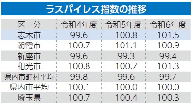令和6年4月1日時点のラスパイレス指数※をみると、さいたま市を除く県内39市平均は100.0ポイントです。志木市は101.5ポイントで、さいたま市を除く県内39市の中で3番目となっています。