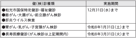 令和7年度和光市国保特定健診・がん検診などの実施期間が終了します。実施終了間際は混雑が予想されます。早めの予約をお願いします。詳細は健康ガイド(成人版)または市HPでご確認ください。