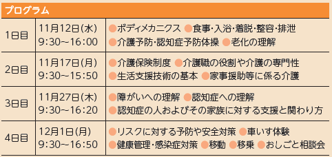 介護に関する知識を身につけるとともに、介護の基本的な技術を学ぶ事ができます。全日程参加すると、市から修了証明書が発行されます。最終日には、仕事について何でも相談できる「おしごと相談会」を実施します。介護の仕事をお考えの人、ご興味のある人ならば大歓迎です!まずはお気軽に「おしごと相談会」で“介護のしごと”について聞いてみましょう。