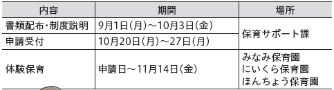保育園生活を送る上で配慮が必要なお子さんの入園について、チャレンジド保育を利用する場合には、別途申請が必要となります。
