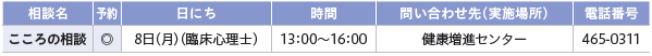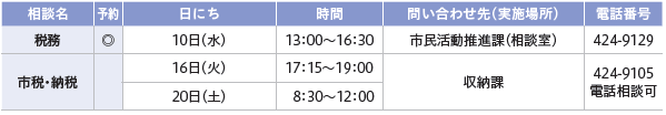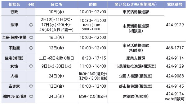 くらし 9月の相談日 39/43 前の記事 次の記事 発行日 : 2025年09月01日 自治体名 : 埼玉県和光市 広報紙名 : 広報わこう 令和7年9月号 相談は無料です。プライバシーは必ず守られます。各相談とも12:00〜13:00は除きます。 予約の欄に◎のあるものは要予約です。日程・場所は変更になる場合があります。 詳細は市HPをご覧いただくか、お問い合わせください。 ◆暮らし ◆税金 ◆子ども ◆健康 ◆仕事 Tweet シェアする わぴあ 9月の休日当番医
