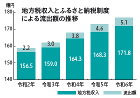 近年、首都圏自治体でふるさと納税流出の報道を多く見かけます。和光市の個人市民税の税収は増加傾向にありますが、ふるさと納税の流出額も年々増加し、令和6年度では約5億円が流出、直近5年間では累計約19億円もの税収が流出しています。市の運営で見ると、道路の維持補修に3億円、ごみや資源の収集運搬に3.2億円、学童クラブ等の管理運営に5億円の費用がかかり、流出による影響は決して小さくありません。