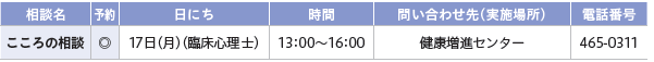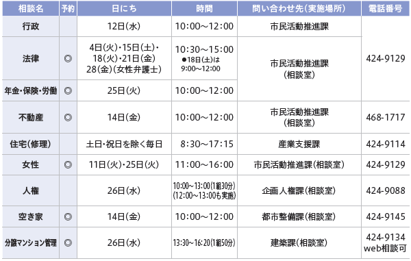 くらし 11月の相談日 38/42 前の記事 次の記事 発行日 : 2025年11月01日 自治体名 : 埼玉県和光市 広報紙名 : 広報わこう 令和7年11月号 相談は無料です。プライバシーは必ず守られます。各相談とも12:00〜13:00は除きます。 予約の欄に◎のあるものは要予約です。日程・場所は変更になる場合があります。 詳細は市HPをご覧いただくか、お問い合わせください。 ◆暮らし ◆税金 ◆子ども ◆健康 ◆仕事 Tweet シェアする わぴあ 11月の休日当番医