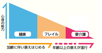 加齢と共に筋力や認知機能などが低下した、「健康」と「要介護」の間の状態のことです。