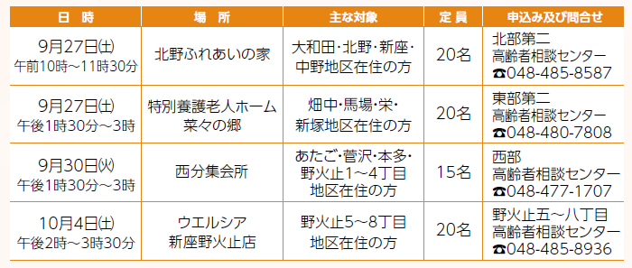 申込み及び問合せ:北部第一高齢者相談センター(【電話】048-486-5011)へ