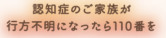 認知症で行方不明になった方の多くは、行方不明になった場所から半径5km圏内で発見されています。 早期発見・保護のため、迷わず110番通報をしてください。