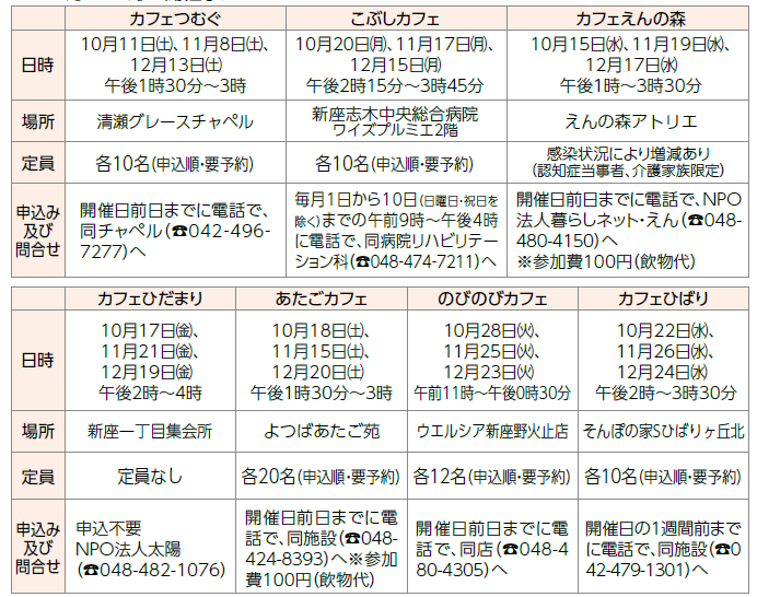 くらし 認知症カフェ(オレンジカフェ) 21/49 前の記事 次の記事 発行日 : 2025年10月01日 自治体名 : 埼玉県新座市 広報紙名 : 広報にいざ 令和7年10月号(No.1102) 認知症の方と家族、地域の方など誰でも立ち寄れる交流の場です。 ■10月~12月の開催予定 Tweet シェアする INFORMATION~シニア・高齢者(2) INFORMATION~福祉・保険