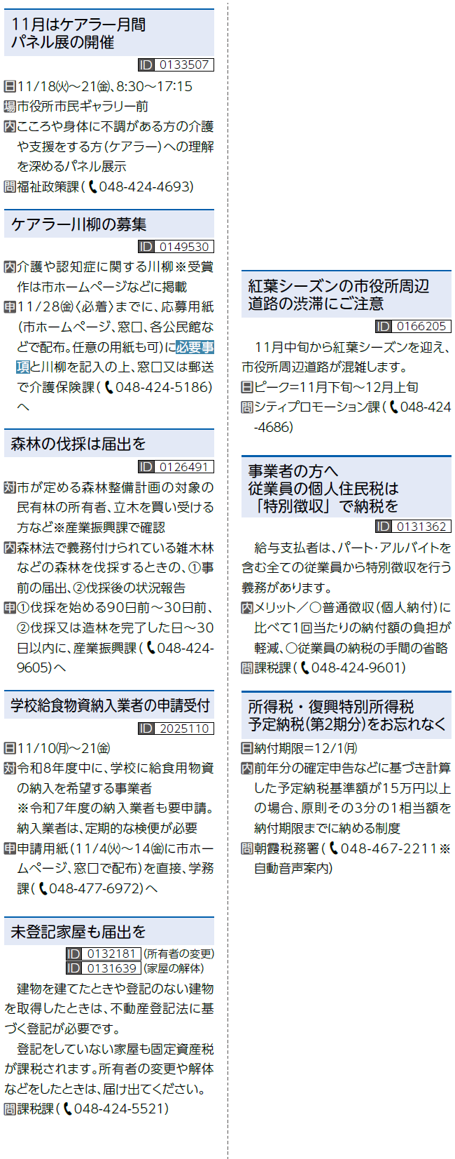 くらし NFORMATION~お知らせ(2) 10/41 前の記事 次の記事 発行日 : 2025年11月01日 自治体名 : 埼玉県新座市 広報紙名 : 広報にいざ 令和7年11月号(No.1103) Tweet シェアする NFORMATION~お知らせ(1) 防災行政無線の訓練放送