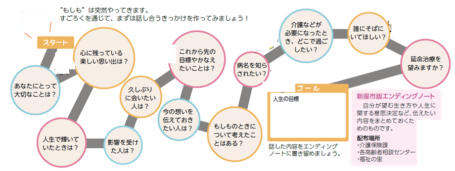 これからの人生をより良く生きるために、あなたが大事にしていることや望んでいること、どこで、どのような医療・ケアを受けたいかを自分自身で前もって考え、周囲の信頼する人たちに共有しておくことを人生会議といいます。