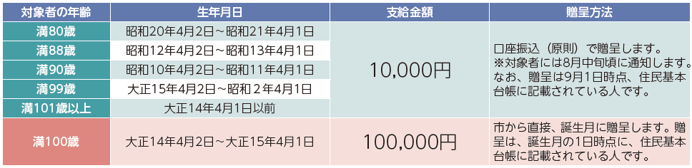 高齢者の皆様がこれまでの豊富な知識と経験を生かし、健康で充実した生活が送れますよう、また、生涯にわたって生きがいを持ち、安心して暮らすことができますよう、ご祈念申し上げまして、9月の敬老事業をご案内します。