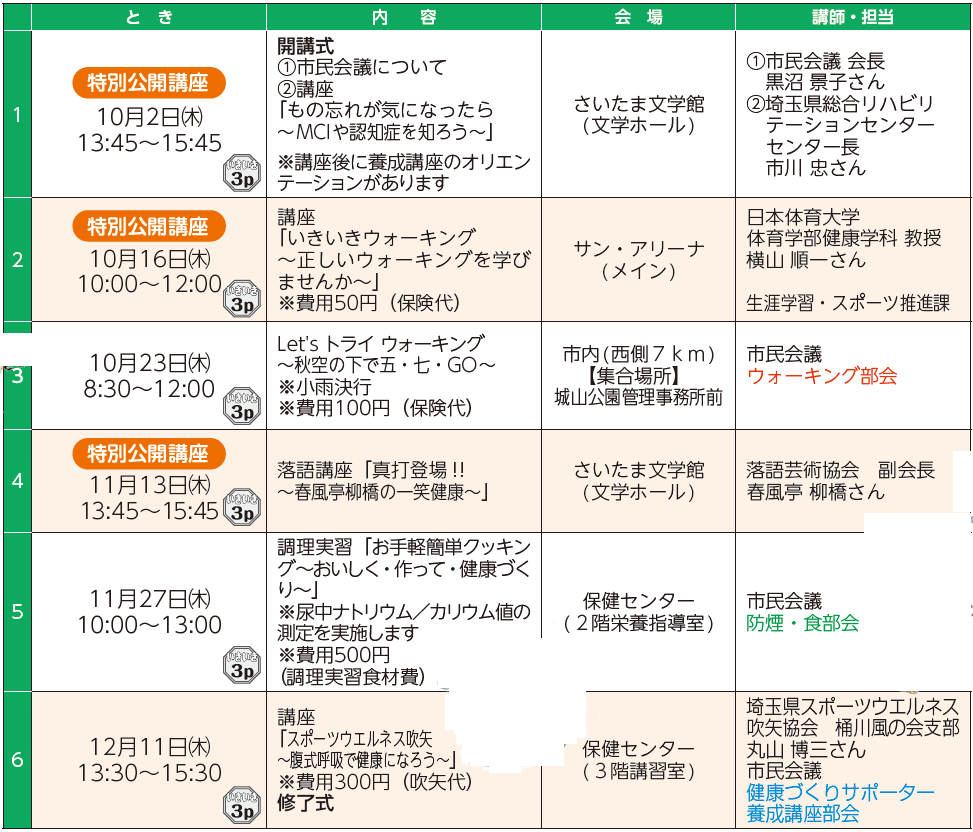 この講座は、健康づくりを推進するボランティア団体の桶川市健康づくり市民会議(P.5下参照)と市が協働で実施します。養成講座を受講し、健康づくりサポーターになり、一緒に健康づくりの輪を広げませんか。