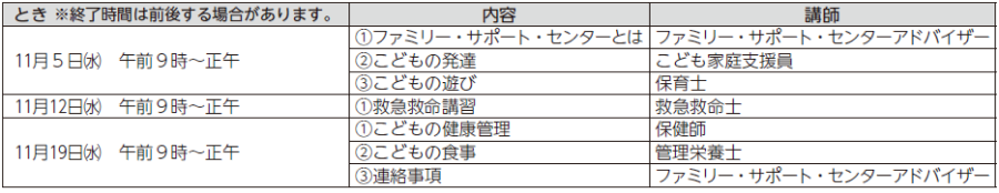 申込み:10月22日(水)までに、電話または直接、ファミリー・サポート・センター(子ども未来課内)【電話】788-4944へ。