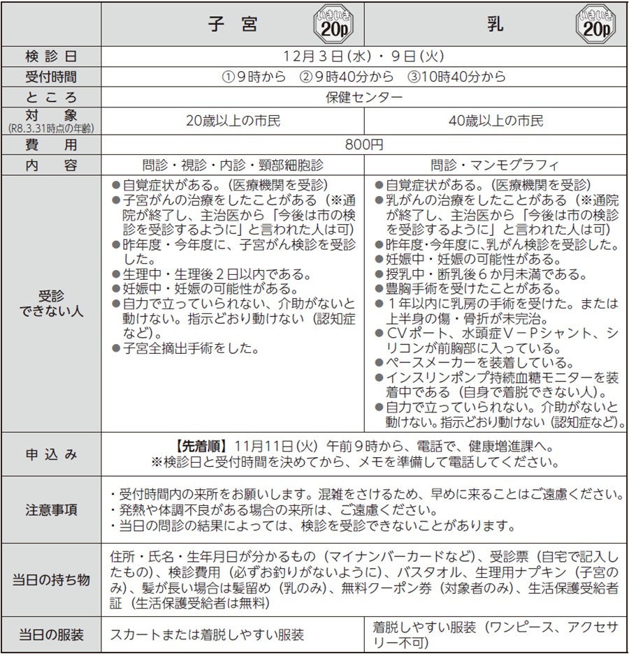 健康 今年最後のチャンスです!集団「女性がん検診」 追加実施のお知らせ 38/58 前の記事 次の記事 発行日 : 2025年11月01日 自治体名 : 埼玉県桶川市 広報紙名 : 広報おけがわ 令和7年11月号 問合せ:健康増進課 【電話】786-1855 Tweet シェアする 健康ステーション(2) お子さんの予防接種はお済みですか?