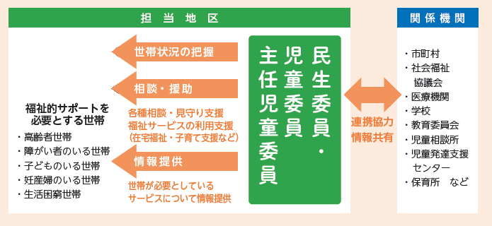 「主任児童委員」は、子どもや子育てに関する支援を専門に担当する民生委員・児童委員です。内容に応じて、相談者の地区を担当する民生委員・児童委員や、行政・学校などと連携して支援活動を行っています。