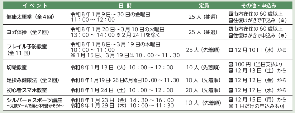 各講座1人1枚(講座名・氏名・住所・年齢・電話番号記入)12月24日(水)に返信予定