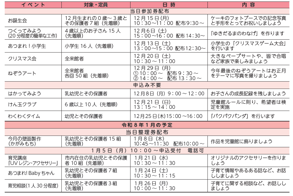 子育て 児童館 36/46 前の記事 次の記事 発行日 : 2025年12月01日 自治体名 : 埼玉県北本市 広報紙名 : 広報きたもと 令和7年12月号 ■児童館の休館日 ・12月18日(木)…空調設備点検のため ・12月31日(水)~令和8年1月2日(金)…年末年始の休館 問合せ:児童館 【電話】598-7643【FAX】598-4786 Tweet シェアする 子育て中の親子のふれあいの場~地域子育て支援拠点~ こども図書館