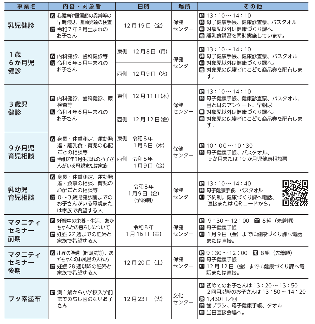 子育て 母子保健のご案内 38/46 前の記事 次の記事 発行日 : 2025年12月01日 自治体名 : 埼玉県北本市 広報紙名 : 広報きたもと 令和7年12月号 ※保健センター…(栄1-1 栄市民活動交流センターB棟3階) ※こども商品券のお問合せ…子育て支援課子育て支援担当(【電話】594-5537) ※東側…高崎線から東側の地域、西側…高崎線から西側の地域 問合せ:健康づくり課母子保健担当 【電話】594-5544 Tweet シェアする こども図書館 各種相談案内