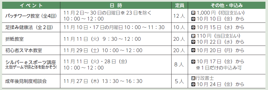 講座 栄市民活動交流センター(ミドリトテラス)高齢者ラウンジ 23/50 前の記事 次の記事 発行日 : 2025年10月01日 自治体名 : 埼玉県北本市 広報紙名 : 広報きたもと 令和7年10月号 場所:高齢者ラウンジ(栄市民活動交流センター(栄1-1)内A棟2階) 対象:北本市・桶川市・鴻巣市在住の60歳以上の人 定員:先着順 費用:特記なければ無料 申込み・問合せ:高齢者ラウンジ(【電話】592-1551)へ電話または直接。 ※9:00~17:00(祝日を除く) Tweet シェアする 募集 健康増進センター