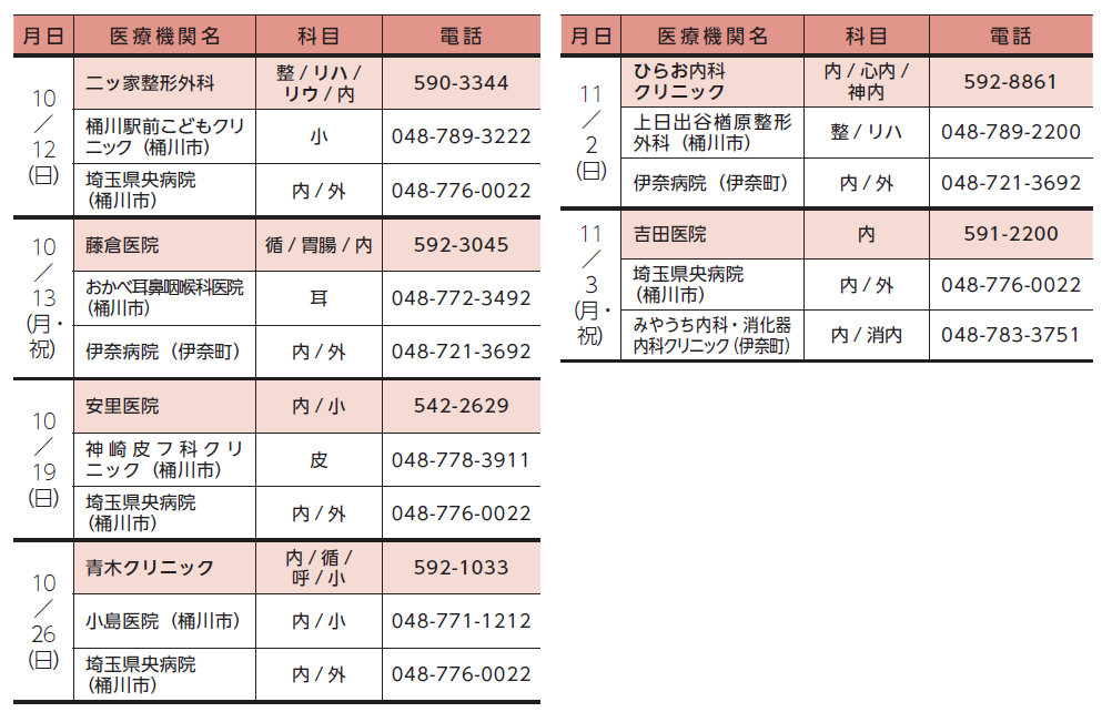 くらし 休日当番医(10月8日~11月7日) 34/50 前の記事 次の記事 発行日 : 2025年10月01日 自治体名 : 埼玉県北本市 広報紙名 : 広報きたもと 令和7年10月号 診療時間:9:00~17:00(時間厳守) 変更の可能性があります。事前に電話で確認をとり、健康保険証をお持ちください。 最新情報は市ホームページ(本紙の二次元コード参照) Tweet シェアする 第13回きたもと駅伝競走大会 ピンクリボンの集い2025