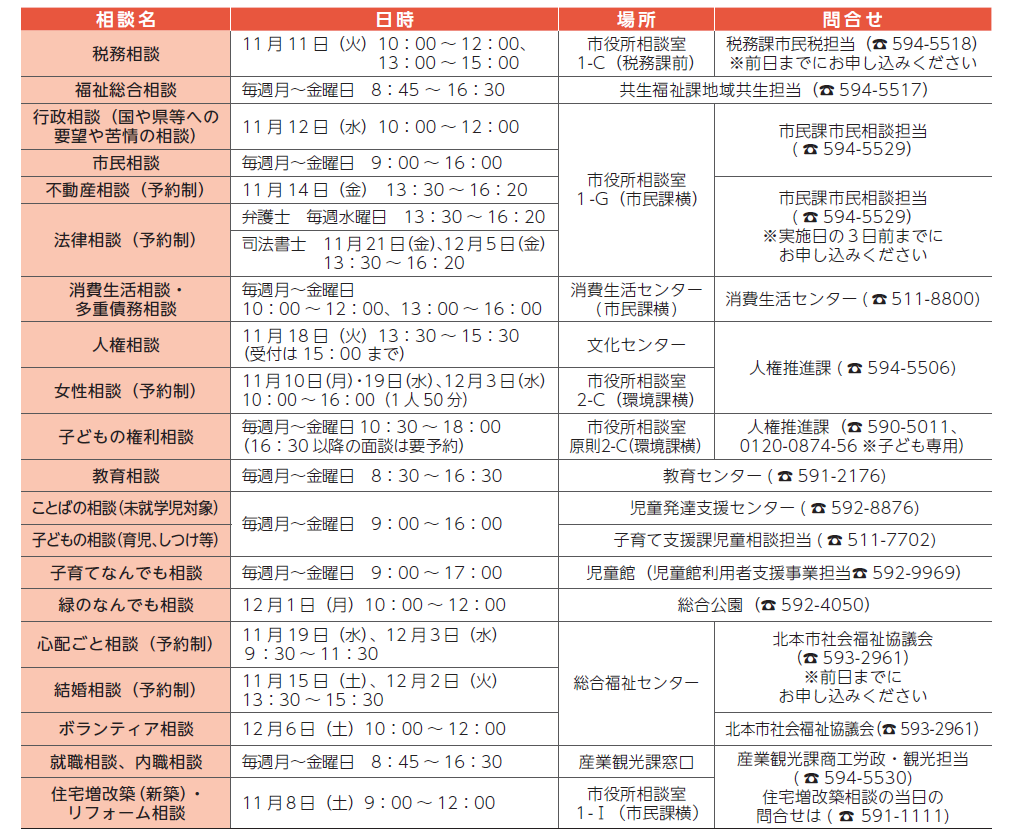 くらし 各種相談案内 49/54 前の記事 次の記事 発行日 : 2025年11月01日 自治体名 : 埼玉県北本市 広報紙名 : 広報きたもと 令和7年11月号 ※状況により中止になる場合があります。 ※相談日が祝日のときはお休みです。 相談日:11月8日~12月7日 Tweet シェアする 暮らしとこころの総合相談会 暮らしの110番 北本市消費生活相談あれこれ vol.189