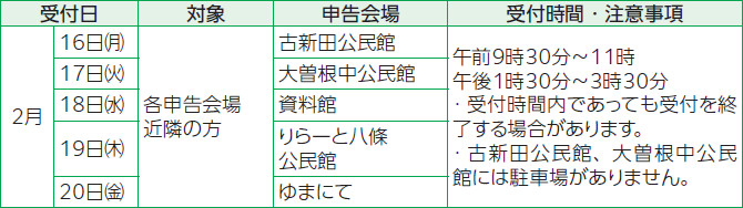 申告会場は、大変混み合います。市民税・県民税の申告はeLTAX個人住民税電子申告システムまたは郵送での申告、所得税などの確定申告はe-Taxでの申告にご協力ください。