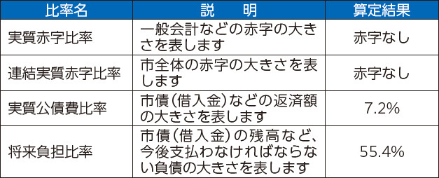 市の比率はいずれも、法令で定められている早期健全化基準(財政再生基準)、経営健全化基準を下回っており、健全な財政を維持しています。詳しくは、市ホームページをご覧ください。
