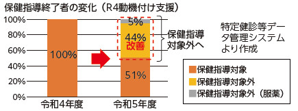 特定保健指導を利用した方の約半数が翌年度の検査数値などが改善され、特定保健指導対象外になりました。案内が届いた方はぜひご利用ください。