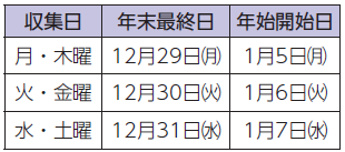 年末年始の収集日は下表のとおりです。ごみが大量に出されるため、通常よりも収集に時間がかかります。