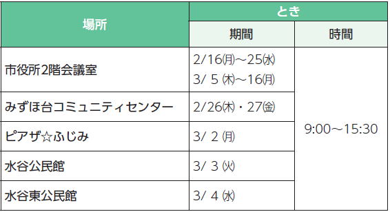 ※市役所以外の会場は、車での来場はご遠慮ください。