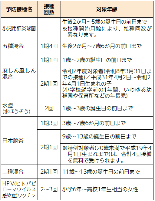 下表以外の定期予防接種もあります。忘れずに受けましょう。