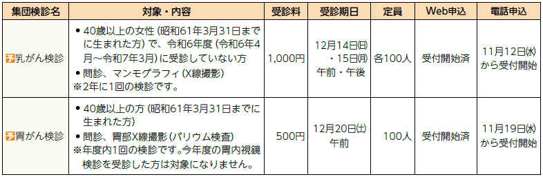 ※乳がん検診…豊胸手術やペースメーカー挿入術を受けている方、妊娠中の方、妊娠の可能性がある方、授乳中の方、授乳終了後6か月未満の方は対象になりません。30歳代の女性が個別に検診を受けた場合、助成制度があります。